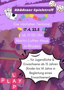 An folgenden Terminen findet der Rhüdener Spieletreff im Martin-Luther-Haus statt: 13.03., 17.04. und 22.05.2026.